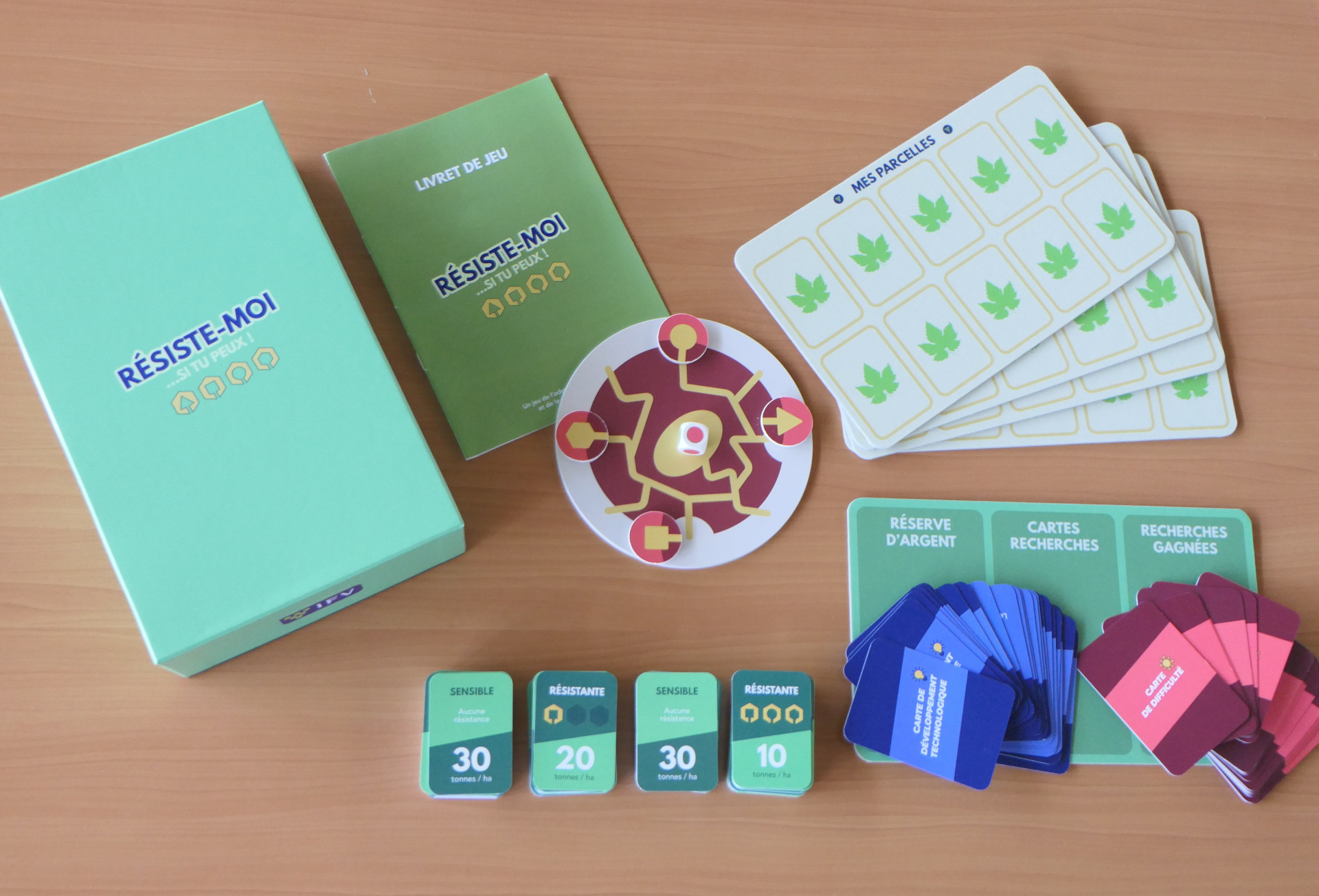 Downy mildew and powdery mildew are major threats to vineyards, typically managed with frequent fungicide use. The GrapeBreed4IPM project aims to reduce pesticide reliance by promoting existing and new grapevines varieties, resistant to diseases (DRVs). Nonetheless, pathogen populations can adapt to new plant material and overcome resistance. Strategic deployment of new plant materials is a key leverage to ensure long-term durability of disease resistance in grapevine varieties. To support this, the project developed an educational board game titled Resist Me If You Can. Up to four players (or teams) act as winegrowers seeking to balance productivity and sustainability over 10 growing seasons. Players aim to reduce fungicide use, maintain yields, and avoid the loss of all pathogen effectors, which would signal that downy mildew populations have adapted to DRV and that resistance was breakdown. The game helps winegrowers, advisors, students, and the public understand the complex interaction between DRVs, pathogen evolution, and integrated pest management (IPM). It mirrors real-life challenges, showing that DRVs must still be supported by IPM tools such as biocontrol, improved spraying, and monitoring. A key message is that poor decisions by one player can impact the entire group—just like in actual viticulture.